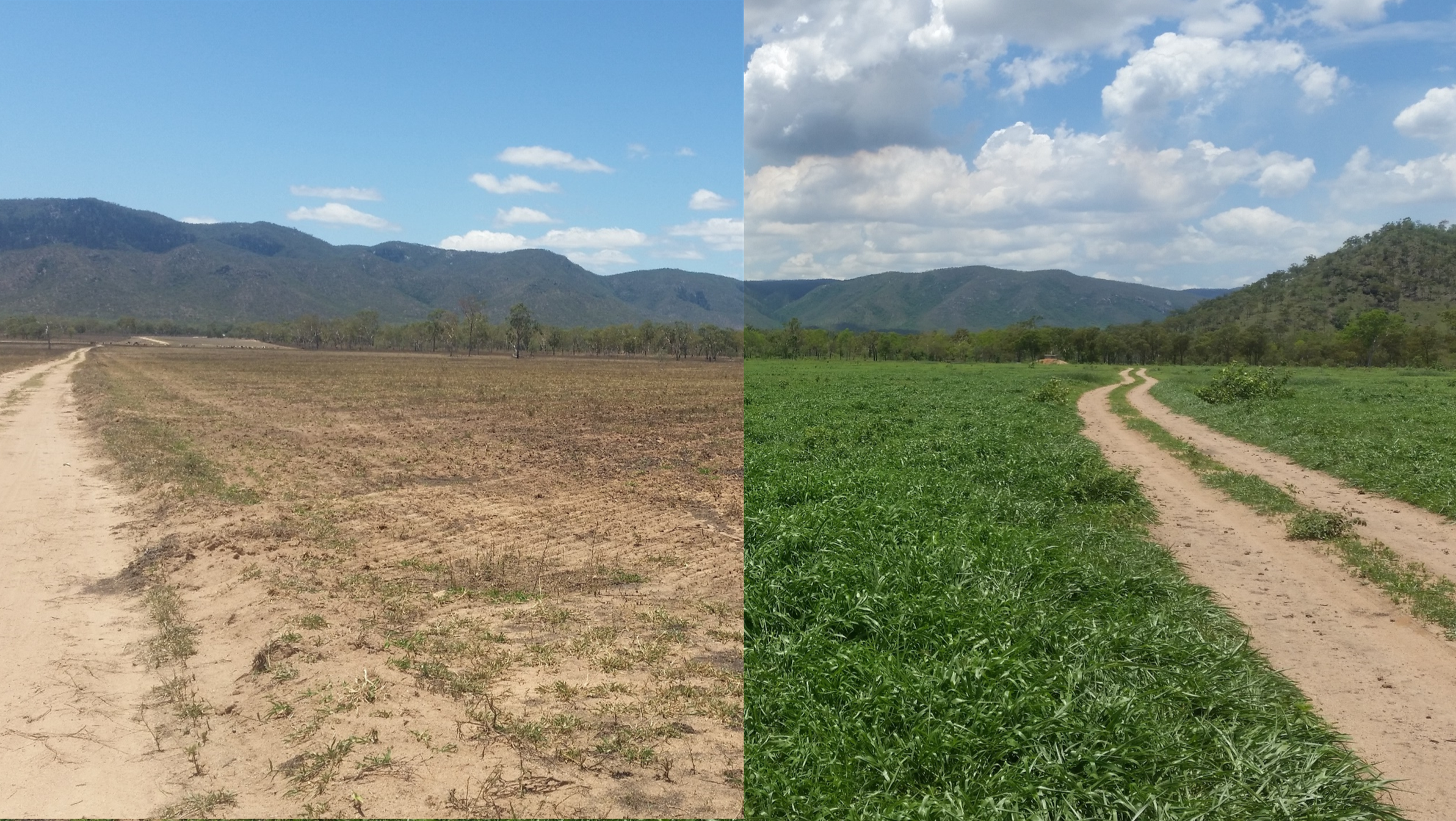 Pasture before (left) and after (right) application of biosolids followed by wet season.